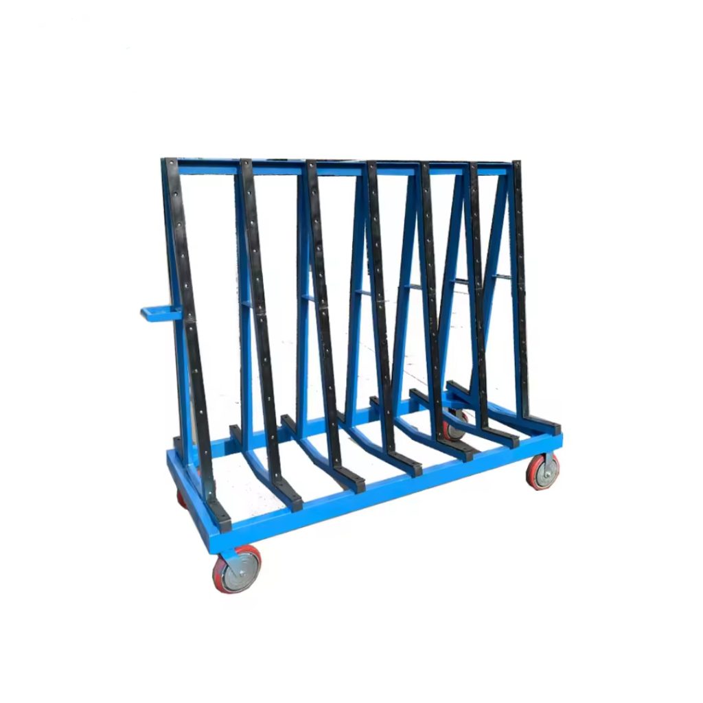 The A-frame rack is suitable for storing dozens of packs of glass raw sheets with the same specifications, enabling standardized and neat stacking to save floor space.