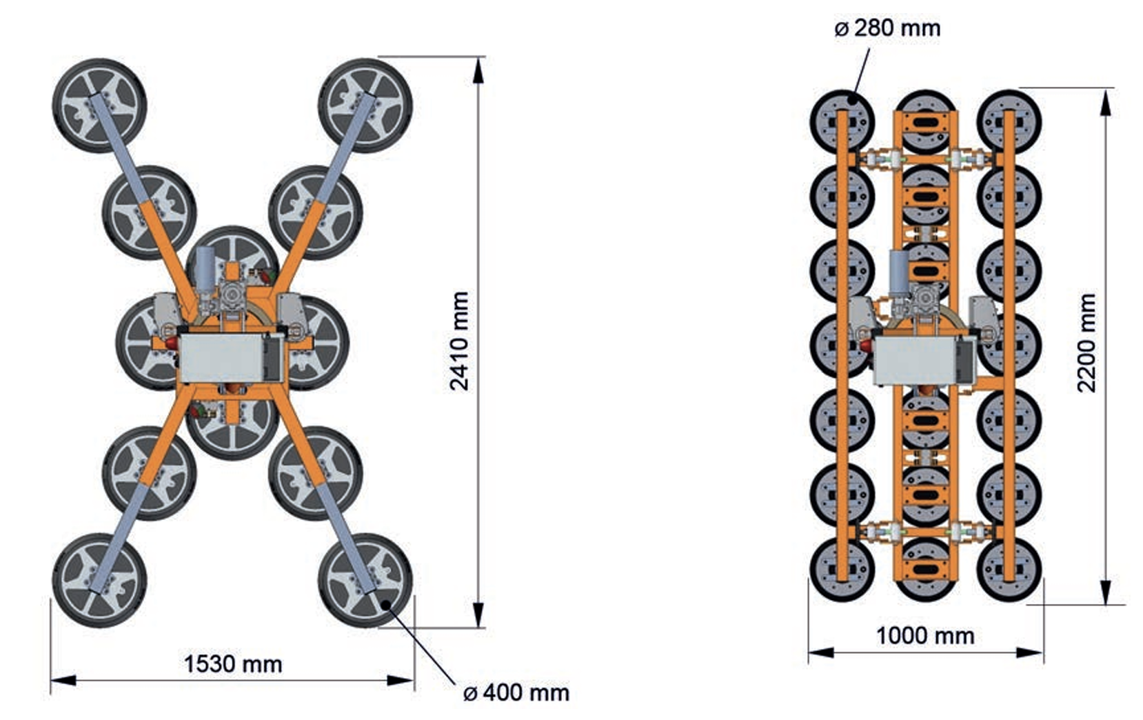 • 2,200 * 1,000 mm with 20 suction pads for curved glass panes, Working Load Limit max. 1,000 kg