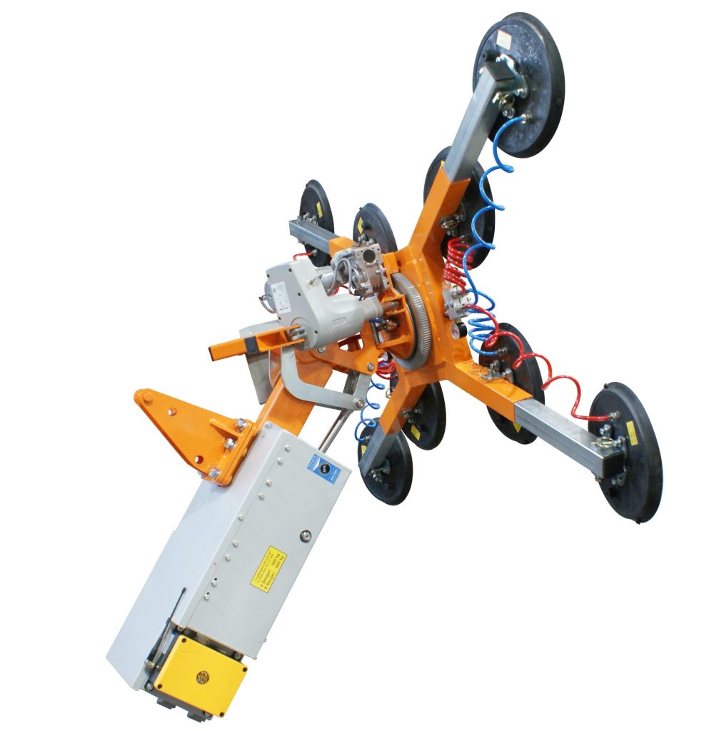 This versatile device attaches to mini cranes and truck loader cranes, enabling glazing in difficult areas. The suction frame tilts hydraulically by 120°, rotates electrically by 360°, and swivels by ±35°. Operated via radio remote control, it’s perfect for both flat and curved panes. Rely on the OKTOPUS® GL-CC 600 DES for precision and reliability in all your glass handling tasks.